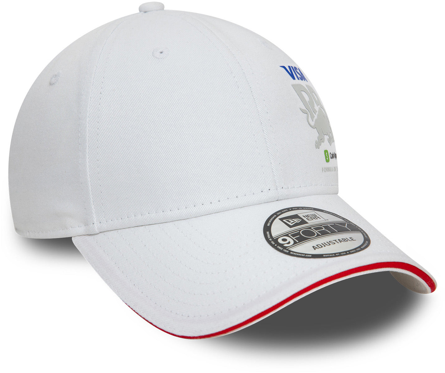 • White with the Visa Cash App Racing Bulls F1 front logo, the New Era Flag side logo, and the Red Visor Sandwhich stripe.