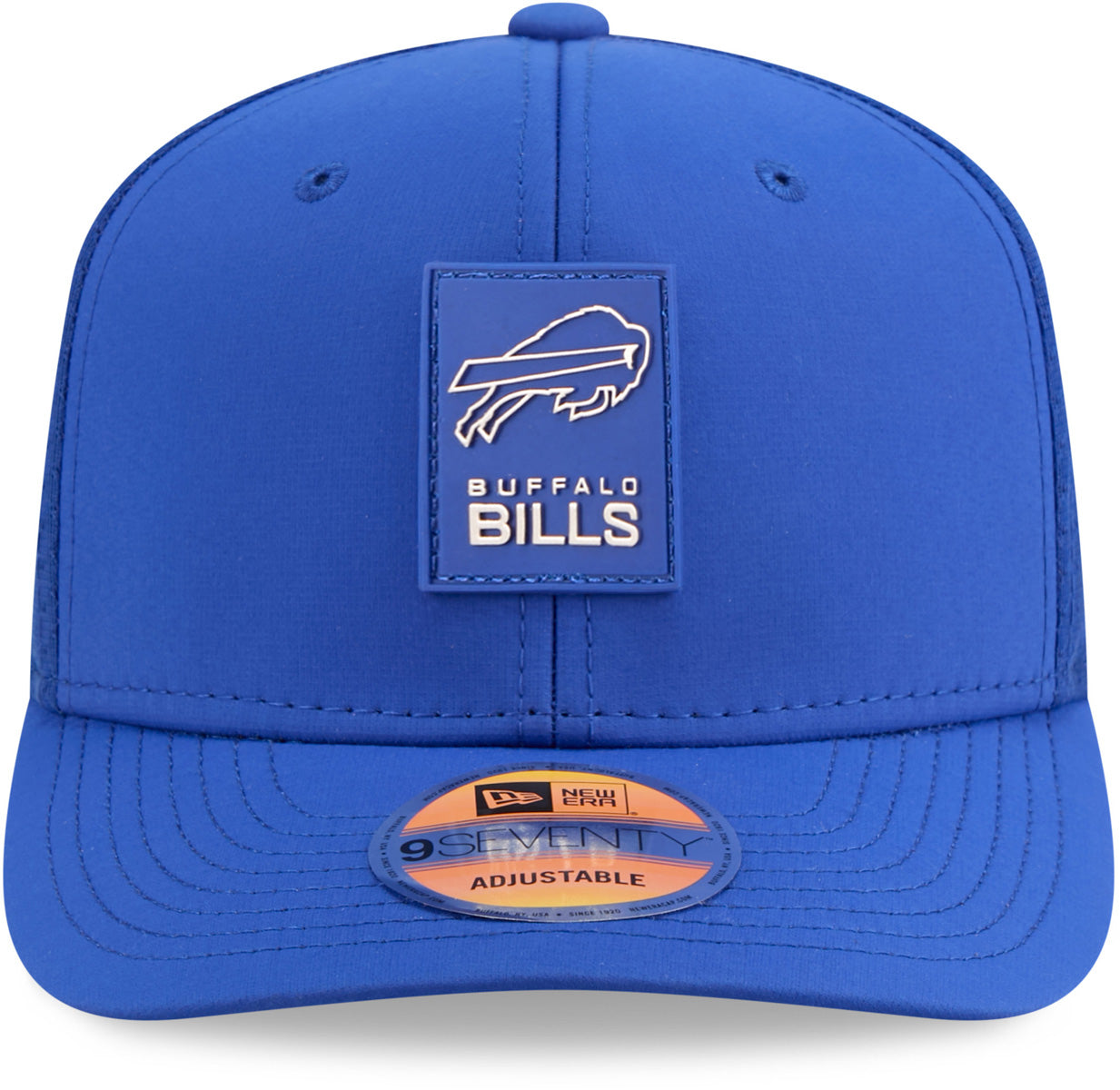 • Blue, with the Buffalo Bills front patch logo, the New Era flag side logo, and NFL rear logo, on the Mesh Backing, and the Team colour stripes on the underside of the Visor.